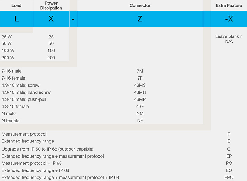 L25-43MH: Load 25 W with 4.3-10 male hand screw type connector.