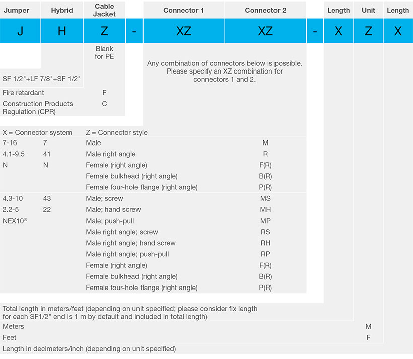 JH-7M43RS-6M: Hybrid jumper with 7-16 male and 4.3-10 male right angle screw type; length of 6 meters; 2x jumper SF 1/2” 1 meter each and feeder LF 7/8” with 4 meters.