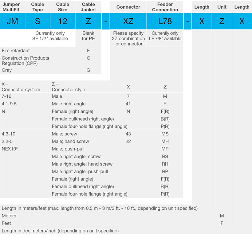 SF 1/2” jumper with 4.3-10 male screw type and assemble to feeder LF 7/8”; length of 1.5 meter.