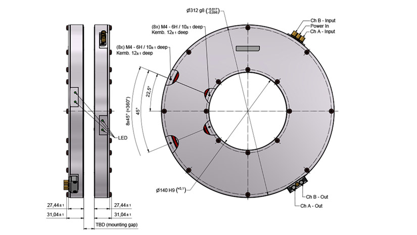 Dieser lagerlose und somit wartungsfreie Drehverbinder hat einen freien Innendurchmesser von 140 mm und ermöglicht zum einen eine sichere IO-Link Übertragung von zwei IO-Link Kanälen und zum anderen die kontaktlose Energieübertragung von bis zu 50W @ 24 VDC zur Bereitstellung der Spannungsversorgung für die angeschlossenen Sensoren.